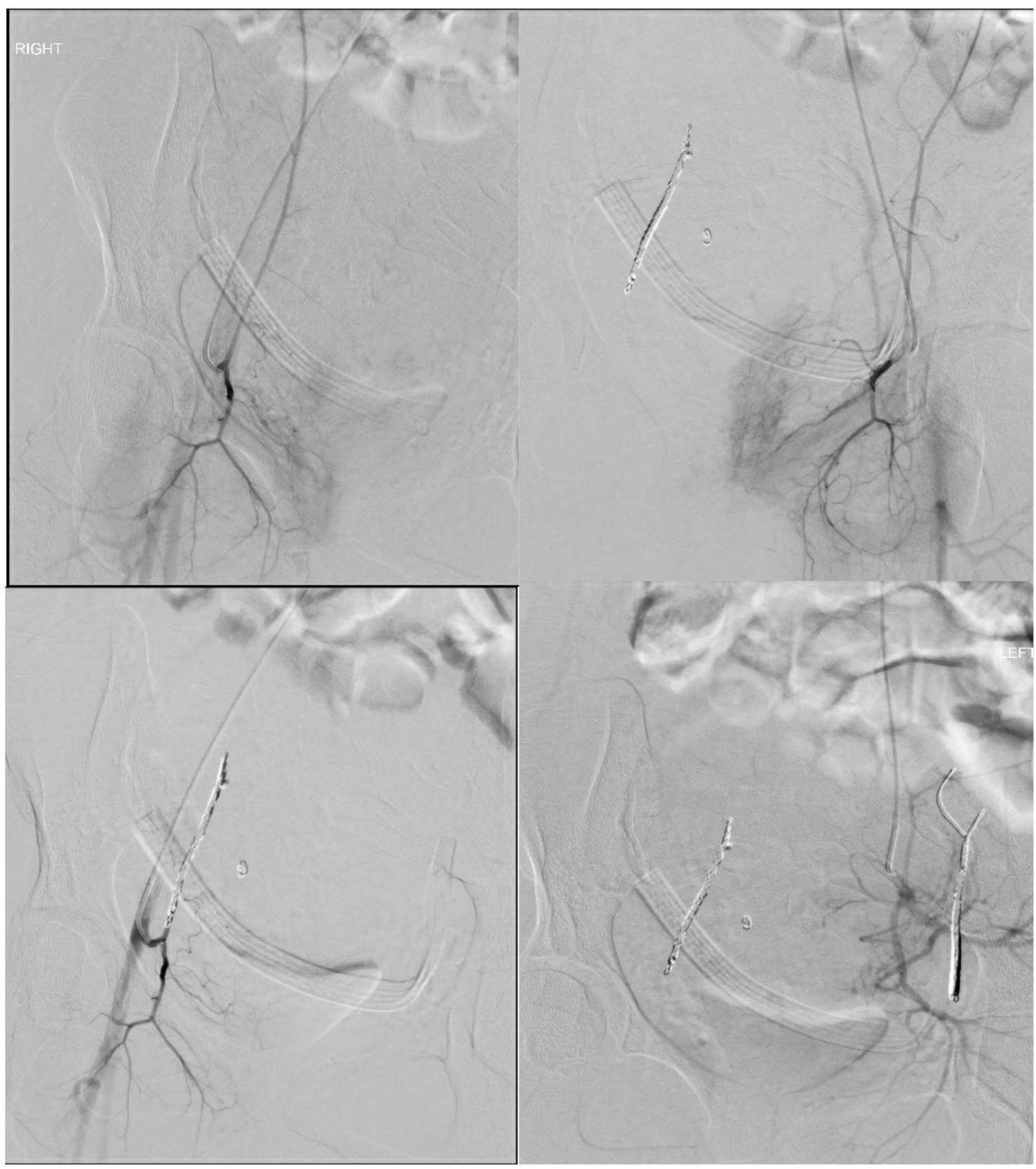 Shortly after transferring the patient to the recovery area, active bleeding was noted at the surgical site, saturating the dressing. Frank red blood was seen in the JP drain. Interventional radiology was consulted to evaluate for possible intravascular embolization. Multiple sites of both the left and right inferior epigastric arteries were identified as sources of active bleeding on CT angiography. Successful coil embolization of bilateral inferior epigastric arteries was performed. Figure 2 demonstrates active extravasation of contrast prior to embolization in comparison to post embolization arteriograms. She received a total of three units of packed red blood cells with and estimated total blood loss of 2000 cc. Despite these losses, the patient remained hemodynamically stable with a normal coagulation profile. The JP drain was removed prior to discharge.