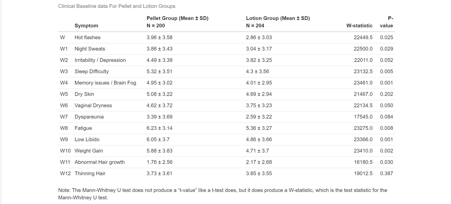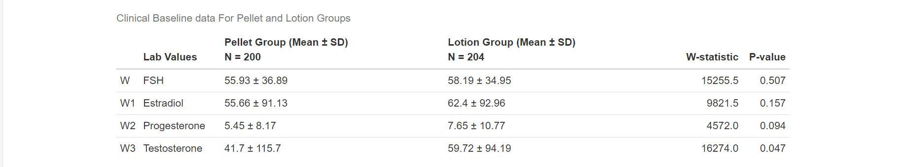 Women on pellet therapy experienced significantly greater improvement in vasomotor symptoms (−2.08 vs −1.03, p<0.003). Further, the pellet group also displayed significantly greater improvement in night sweats (p=0.0016), sleep difficulty (p=0.0002), memory issues (p=0.001), dry skin (p=0.009), vaginal dryness (p=0.000), dyspareunia (p=0.010), fatigue (p=0.001), weight gain (p=0.04), and low libido (p=0.0002). No significant difference was seen between groups in abnormal hair growth (0.25), depression (p=0.059), and thinning hair (0.39). (Table 4). Women on pellet therapy had larger increases in serum testosterone and larger decreases in FSH compared to women using lotion (Table 3, Table 5)).