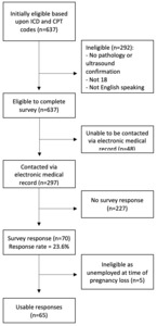 An initial study pool was created of patients that received ICD-10 diagnosis codes of O00-O08 and/or CPT billing codes of 59414, 59812, 59820, 59830, 59840, 59850-59852, 59855-59857, 59870, S0190, S0191, or S0199 in 2022. After determining which of these patients were eligible, all eligible patients were sent an invitation to take the anonymous survey on July 7, 2023 through the electronic medical record. Communications emphasized the survey was anonymous and optional, with participants able to stop completion of the survey at any time. Survey data was collected over two weeks from 7 July 2023 through 21 July 2023 using Research Electronic Data Capture (RED-Cap).
