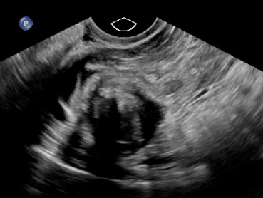 A 30-year-old female, gravida 2, para 1 (vaginal birth), with no significant medical history presented to the emergency department at approximately 4 weeks gestation after sudden onset of sharp stabbing midline and left lower quadrant abdominal pain. Patient denied any vaginal bleeding.