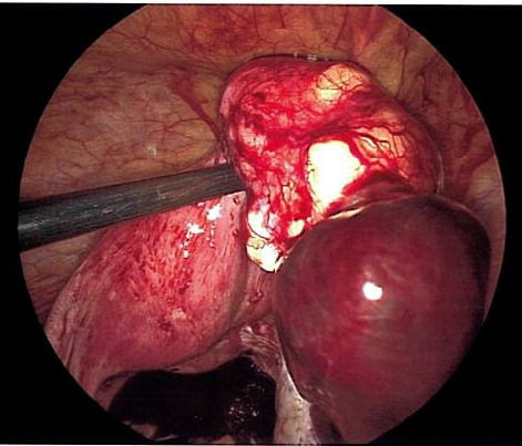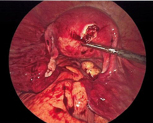 The patient was taken urgently to the operating room for diagnostic laparoscopy due to concern for right adnexal ectopic pregnancy. Upon entry into the abdomen, hemoperitoneum was noted extending into bilateral paracolic gutters. Following removal of this clot, a ruptured ectopic pregnancy was identified at the inferior pole of a 4 cm pedunculated fibroid arising from the posterior fundal surface of the uterus with active bleeding (Figure 2). This ectopic pregnancy revealed no involvement of bilateral adnexa. Pelvic survey revealed normal bilateral fallopian tubes and ovaries. The pedunculated fibroid and ectopic pregnancy were resected with the Ligasure impact device and removed from the abdomen by two separate Endocatch bags. The base of the myomectomy (Figure 3) was oversewn with 2-0 vicryl for additional hemostasis.