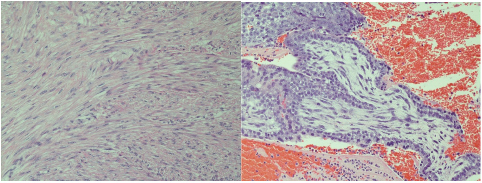 The patient had an uncomplicated postoperative course and was meeting all expected postoperative milestones at her 6 week follow-up. Surgical pathology confirmed diagnosis with visualized rare immature chorionic villi and syncytiotrophblasts, consistent with products of conception and leiomyoma. Her β human chorionic gonadotropin was followed to a negative value (2.7 mIU/mL) which occurred at 2 weeks postoperatively.
