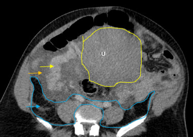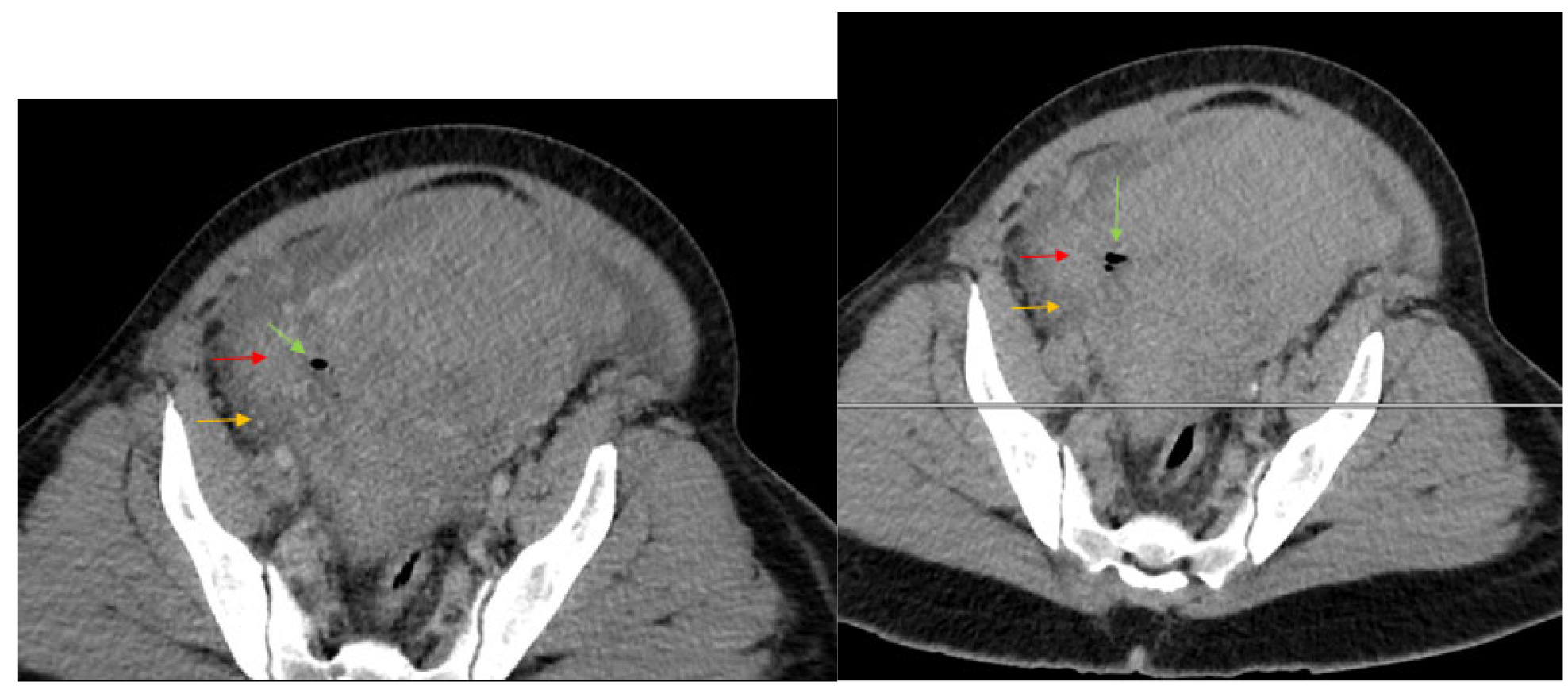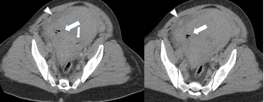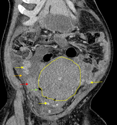 The initial impressions of the axial and coronal CT images revealed dilation of the right ovarian vein in addition to intraperitoneal fluid accumulation on the right side (Fig. 1-2). Portovenous and delayed phase images did not demonstrate contrast pooling or persistent hyperattenuation to suggest hyperacute hemorrhage (Fig. 3-4). Additionally, there was evidence of peritoneal air present between the uterine myometrium and ovarian vasculature most notable along the right aspect of the anterior inferior uterus. A contour abnormality along the right parasagittal lower uterine segment was also noted and interpreted as a uterine defect without signs of free intraperitoneal hemorrhage. In conjunction with her clinical picture, these radiologic findings raised our suspicion for a contained uterine rupture although there were no pathognomonic imaging findings to confirm an associated retroperitoneal hematoma. The patient was urgently taken to the operating room for an exploratory laparotomy to confirm the diagnosis and to manage surgically if indicated.