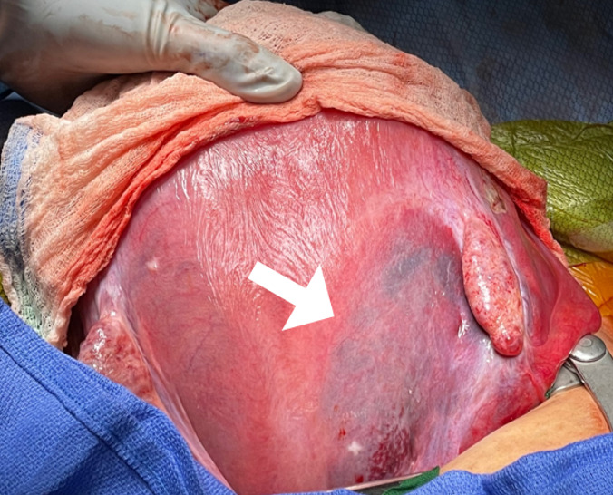 There was no evidence of hemoperitoneum upon abdominal entry. There was a minor 1 cm x 1 cm superficial serosal defect noted at the right cornua, which was hemostatic and secondary to manipulation of the uterus. Most notably, a large non-expanding right-sided broad ligament hematoma measuring 15 cm x 6 cm was noted extending into the retroperitoneal space over the site of suspected uterine rupture (Fig. 5-7). The patient remained hemodynamically stable intraoperatively, and following direct observation, the hematoma was noted to be non-expanding. The uterus was taken off tension, and the decision was made to close the patient without further intervention.